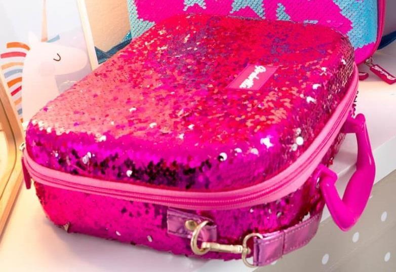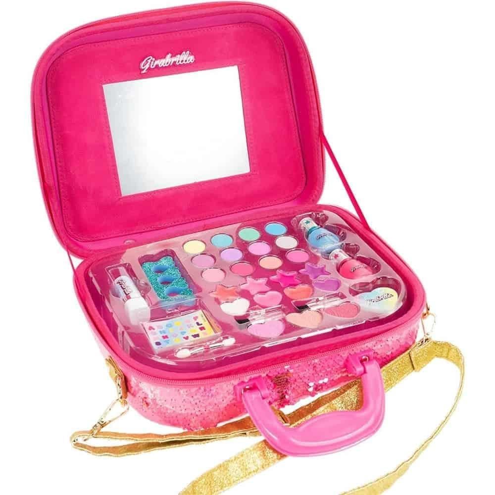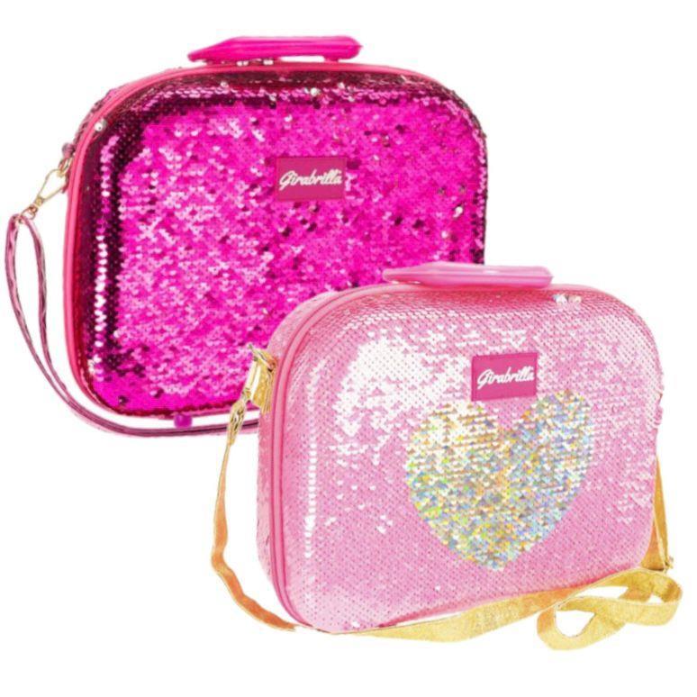 Girabrilla’yı tüm kızların sevdiği bir marka yapan o makyaj çantası: Pullu payetle kaplı aynalı sert çanta, saplı ve ayarlanabilir omuz askılıdır. İçinde çok sayıda göz farı, allık, dudak parlatıcısı, aplikatör ve ışıltılı tırnaklar için malzeme bulunmaktadır.