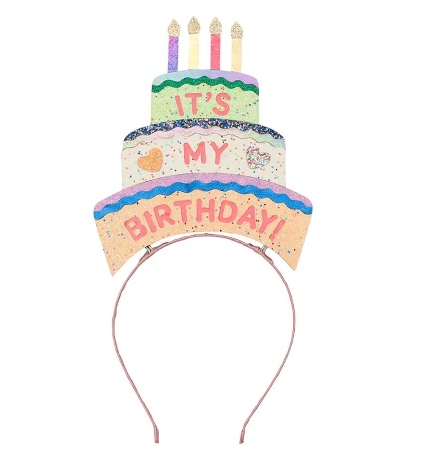 Mimi & Lula Birthday Cake Taç, doğum günü kızının tüm dikkatleri üzerine çekmesini sağlayan süper ışıltılı ve gösterişli bir taçtır. Yumuşak pembe saten kaplı alice bant üzerine yerleştirilmiş, üç katlı doğum günü pastası ince simli kumaşlardan yapılmış, simli kalpler ve "It's my birthday" yazısı pembe renkte detaylandırılmıştır.
