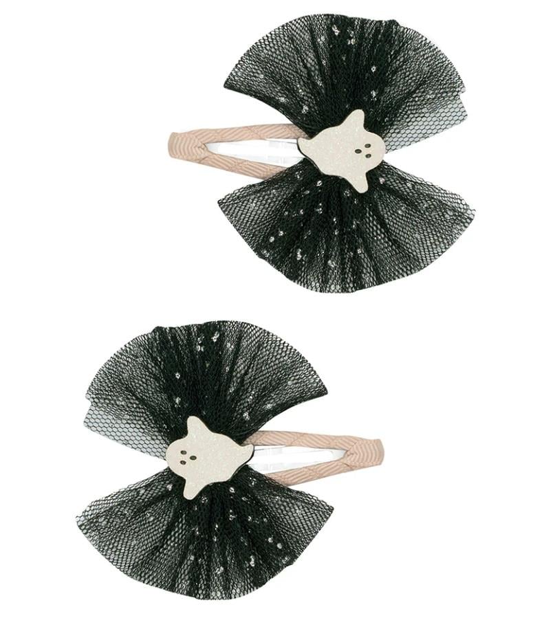Mimi & Lula Ghoulish Ghost Tulle 2'li Toka, büyük siyah, altın simli tül fiyonkların üzerinde küçük sevimli hayalet figürleriyle dolu güzel bir çift toka sunar. Bu şık set, korkutuculuktan çok şıklığı temsil eder.