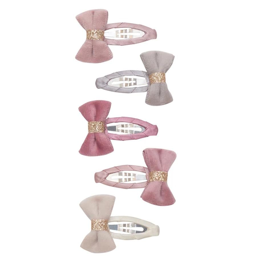 Mimi & Lula Tinkerbell Velvet Mini 5'li Toka, en yumuşak kadifeden üretilmiş ve ortasında parıldayan metalik altın detayla süslenmiş şirin fiyonklarıyla her saç stiline zarif bir dokunuş katıyor. Yumuşak pembe, gri ve krem tonlarında sunulan bu tokalar, tek tek ya da birden fazla kullanılarak şık ve eğlenceli kombinler oluşturabilir.