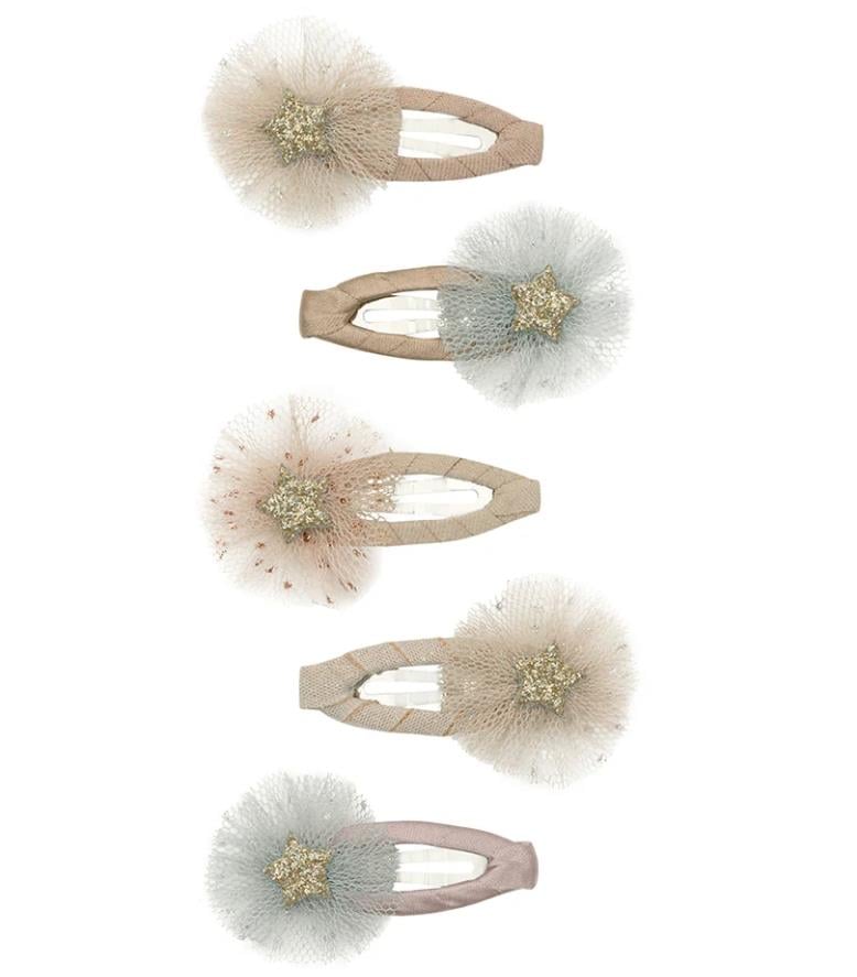 Mimi & Lula Tulle Rosette Mini 5'li Toka, yumuşak ve zarif tül rozetler ile parıldayan altın simli yıldız merkezlerinden oluşan şirin tokalar sunuyor. Parti günleri, kostüm oyunları veya günlük ışıltı için ideal olan bu tokalar, saçlara neşe ve şıklık katıyor.
