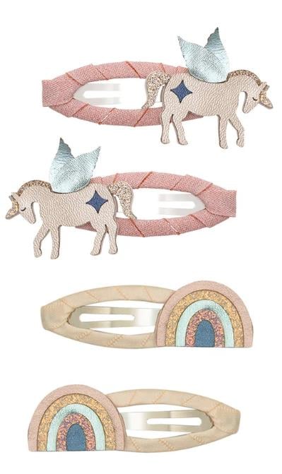 Mimi & Lula Winged Unicorn & Rainbow 4'lü Toka, kanatlı unicornlar ve sevimli gökkuşaklarıyla saçlara efsanevi bir büyü katıyor. Yumuşak metalik ve ince sim kumaşlardan özenle hazırlanmış bu tokalar, küçüklerin favorisi olacak.