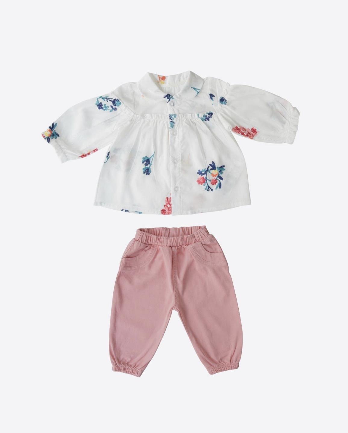 Bu iki parçalı takım, nefes alabilen pamuklu kumaşı sayesinde bebeğinizin hassas cildi için idealdir. Rahat kesimli pembe pantolonu ve zarif nakış detaylı gömleği ile günlük kullanımda veya özel günlerde tercih edebilirsiniz.
