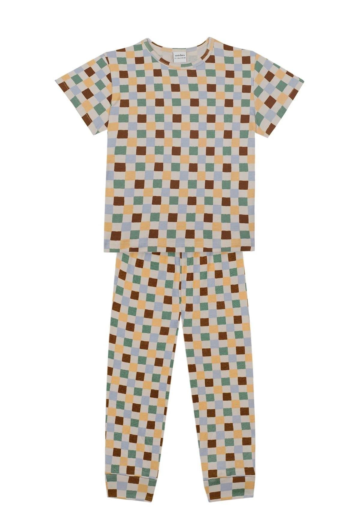 Pastel Damalar Kısa Kollu Uzun Alt Pijama Takımı